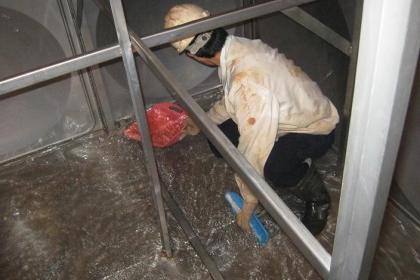 2.清洗时工作人员穿戴好清洁的工作衣,长靴、橡胶手套,并备有照明用具及清扫专用工具,(必须清洗、后)带入箱池。