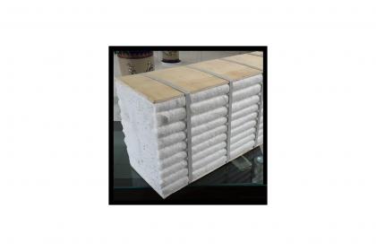 在锌锅火道外侧做保温,包括侧墙和锌锅盖板顶部两部分。可采取平铺两层30mm厚的陶瓷纤维毯(压缩至50mm厚),而后用250-300mm厚的陶瓷纤维模块,总保温厚度在300-350mm。采用兵列示排布方式,在盖板顶部采用陶瓷纤维板,防止火道内风速将陶瓷纤维材料吹散堵塞火眼,所以在顶部采用陶瓷纤维板做保温,一般采用两层50mm厚陶瓷纤维板错缝拼接。